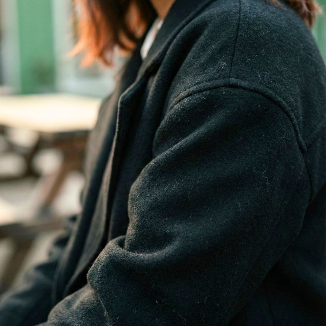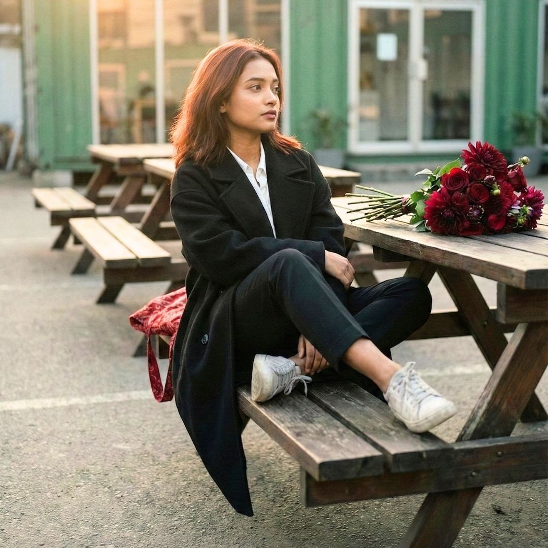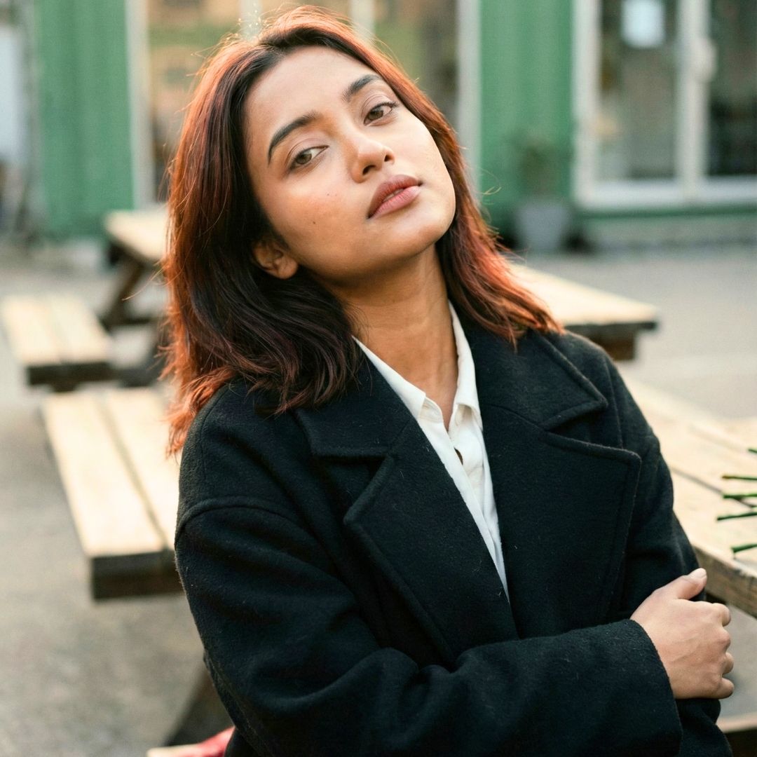 Good: "A young South Asian woman with medium-brown skin wearing an oversized black wool overcoat, sitting on a wooden bench in an urban courtyard."