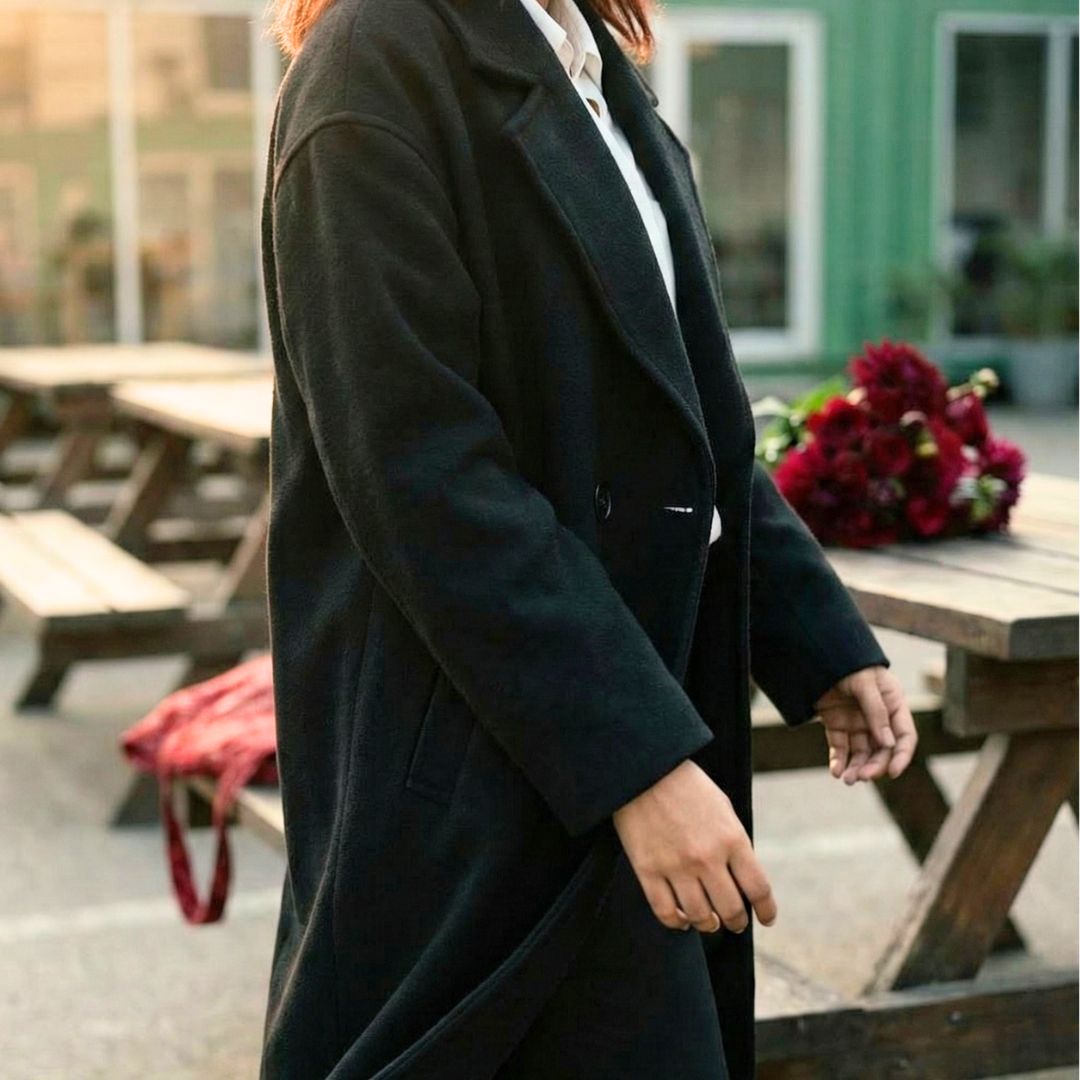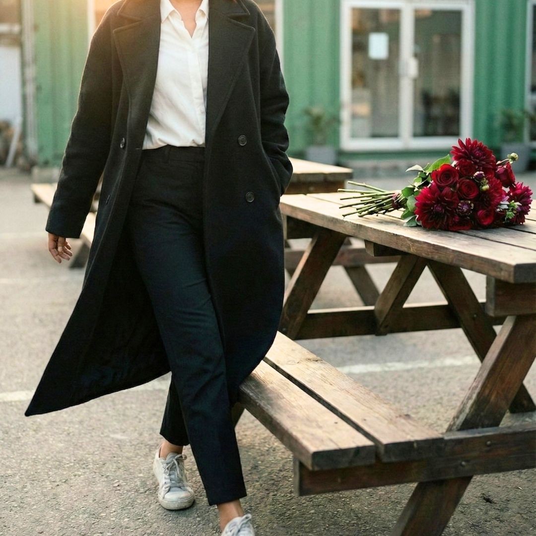 Replace:"oversized black wool overcoat layered over a crisp white collared shirt, tailored black trousers, and white-gray lace-up sneakers"
